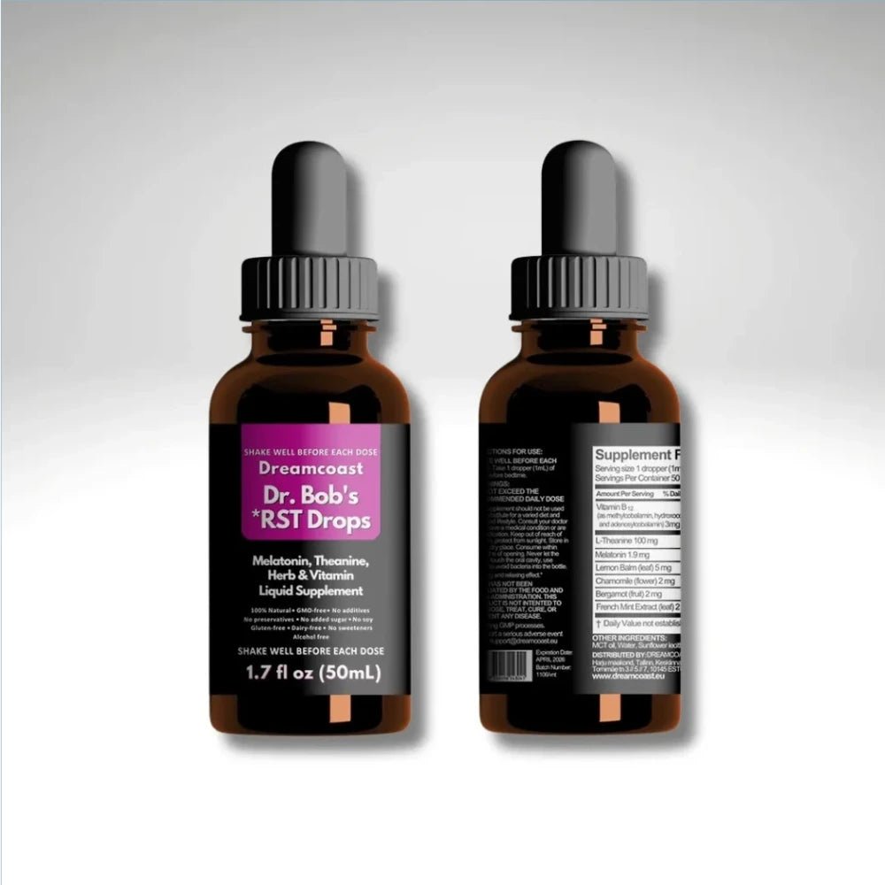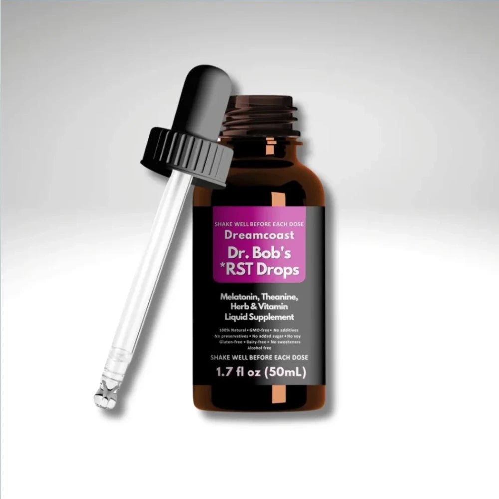 Dreamcoastin Dr. Bob's Stress reset drops melatoniinitipat avoin lasipullo ja taustalla Dreamcoastin pakastekuivatut mansikat ja Berry Bites kuvat.