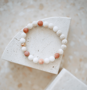 Joustavassa rannekorussa on luonnonkivihelmiä vaaleissa sävyissä sekä neljä beigensävyistä diffuuserihelmeä, joihin voit lisätä eteeristä öljyä tai suihkauttaa suosikkihajuvettäsi. Korua viimeistelee hienovarainen kullanvärinen ruostumattomasta teräksestä valmistettu helmi, jossa on ohut 14 karaatin kultapinnoite.