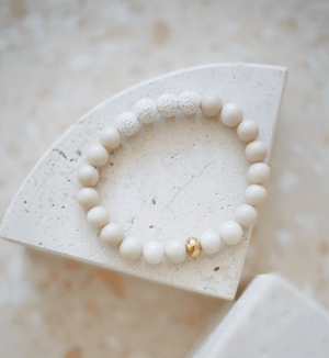 Joustavassa rannekorussa on beigensävyisiä luonnonkivihelmiä sekä neljä yhteensopivaa diffuuserihelmeä, joihin voit lisätä eteeristä öljyä. Korua viimeistelee kullanvärinen ruostumattomasta teräksestä valmistettu helmi, jossa on ohut 14 karaatin kultapinnoite – pieni, harkittu yksityiskohta.
